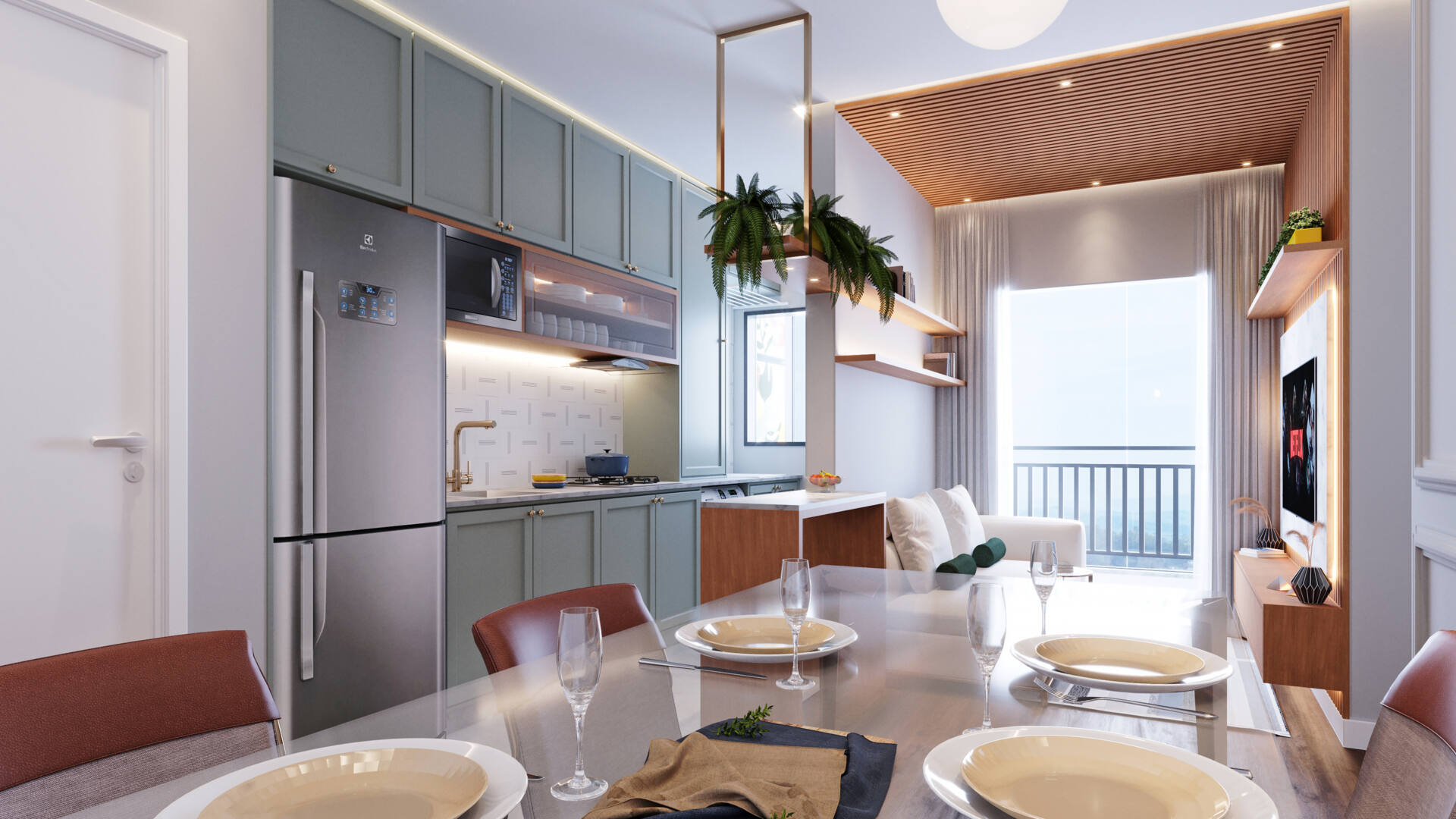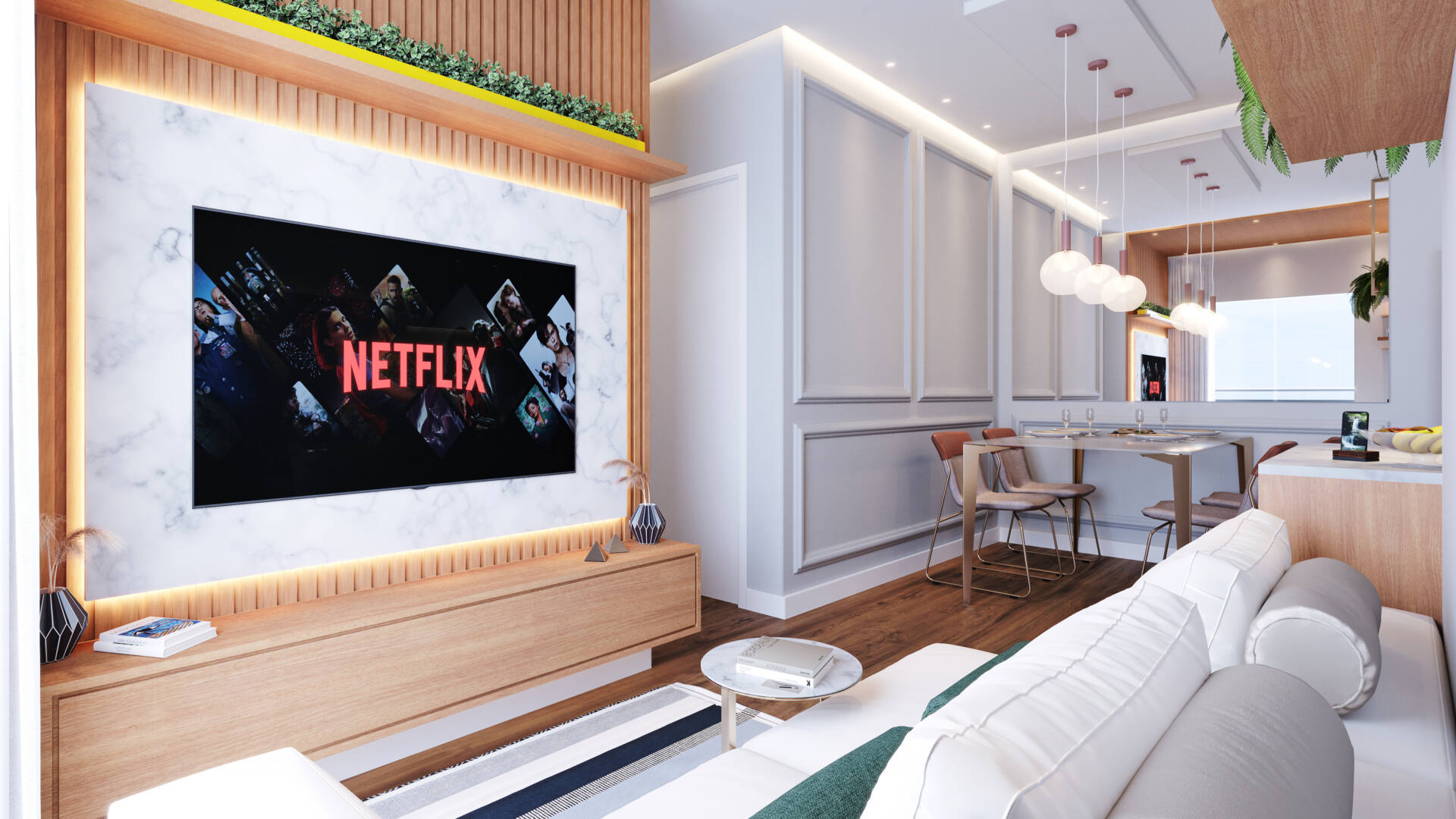 Living – Espaço total com 56m², 2 dormitórios, sendo 1 suíte, cozinha e área de serviço amplas, varanda gourmet e banheiro social.