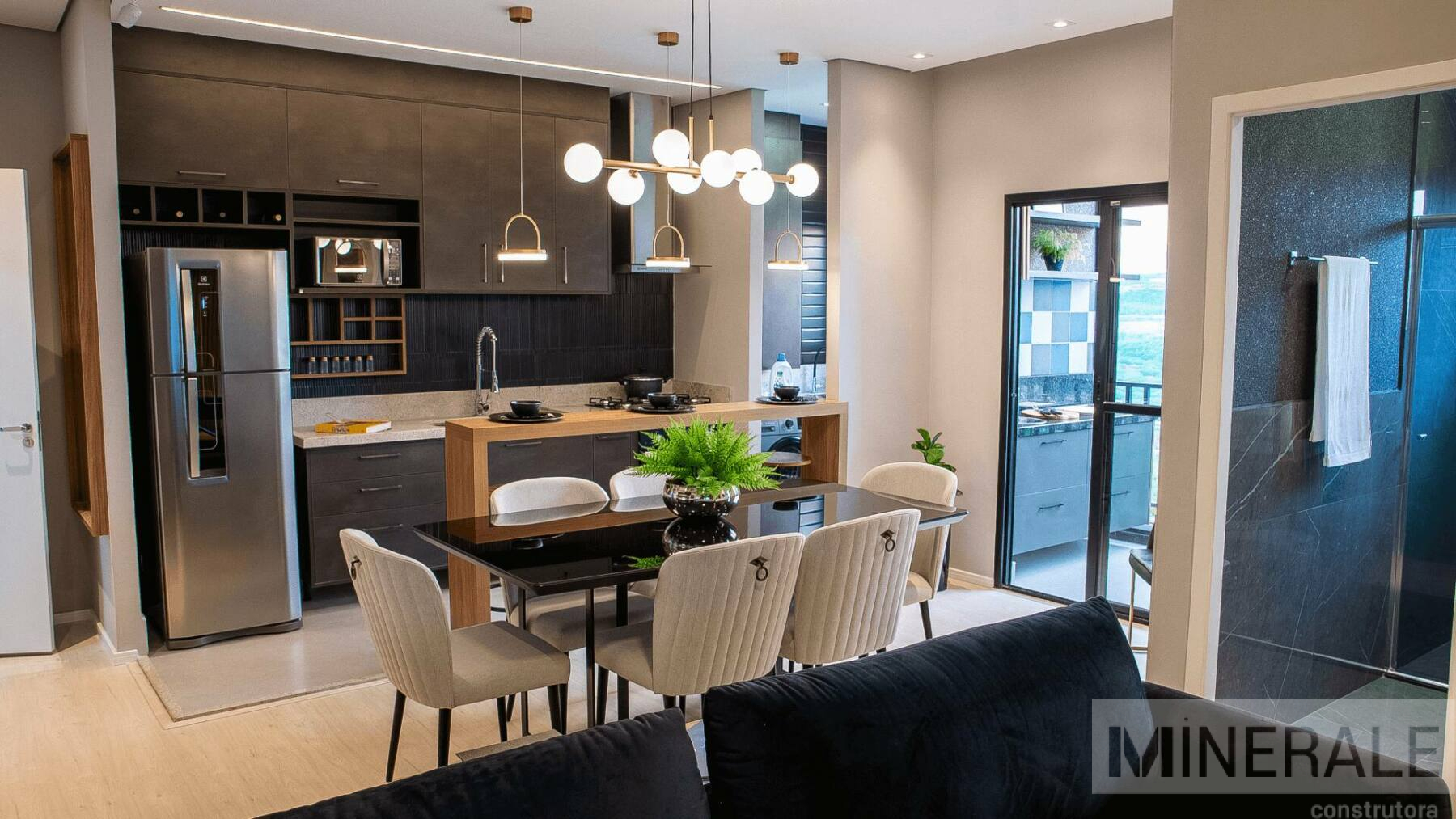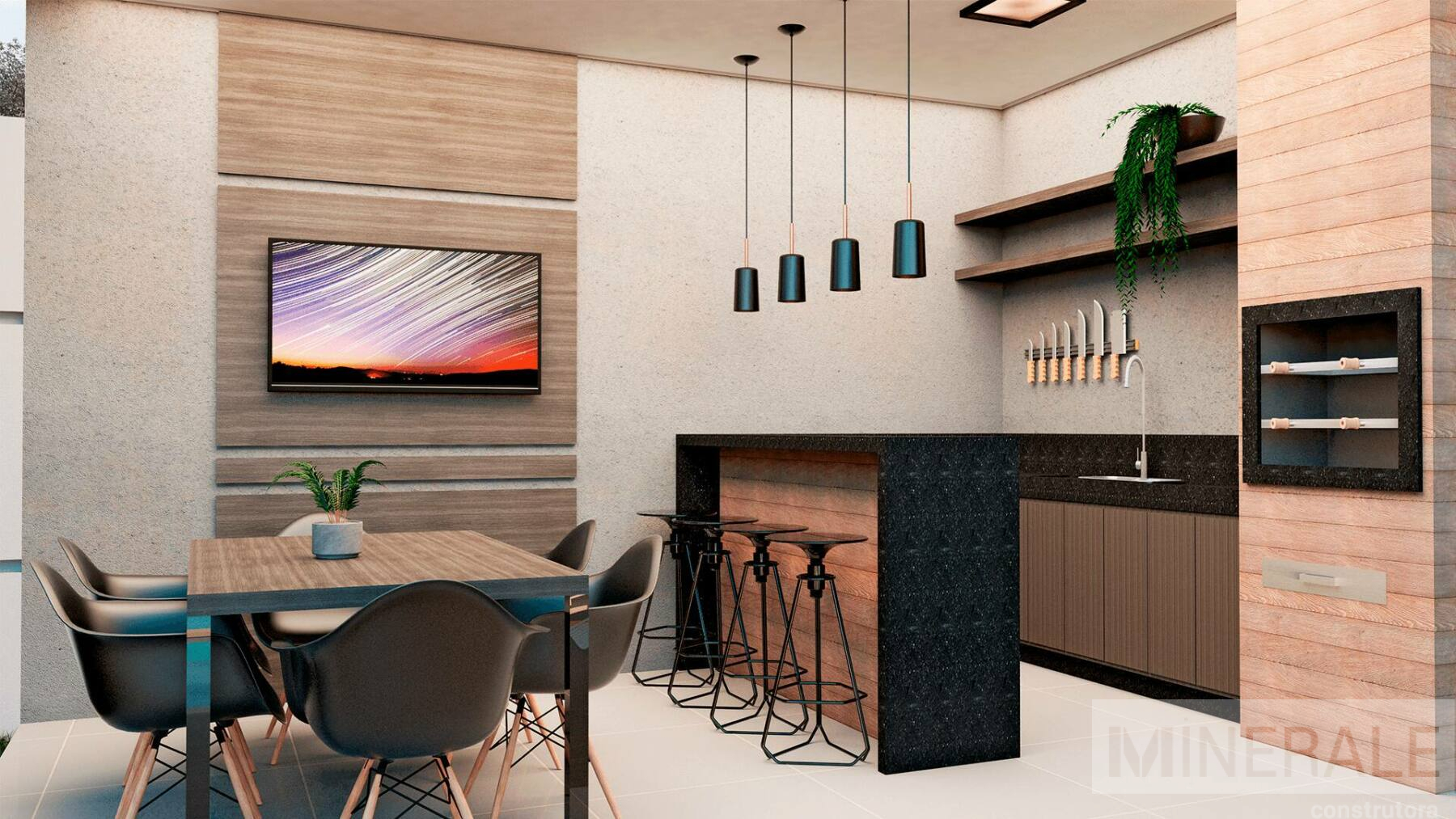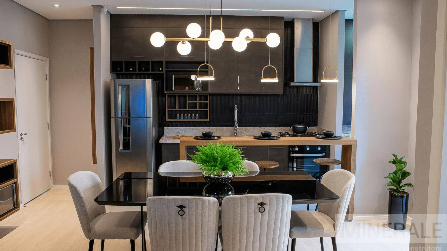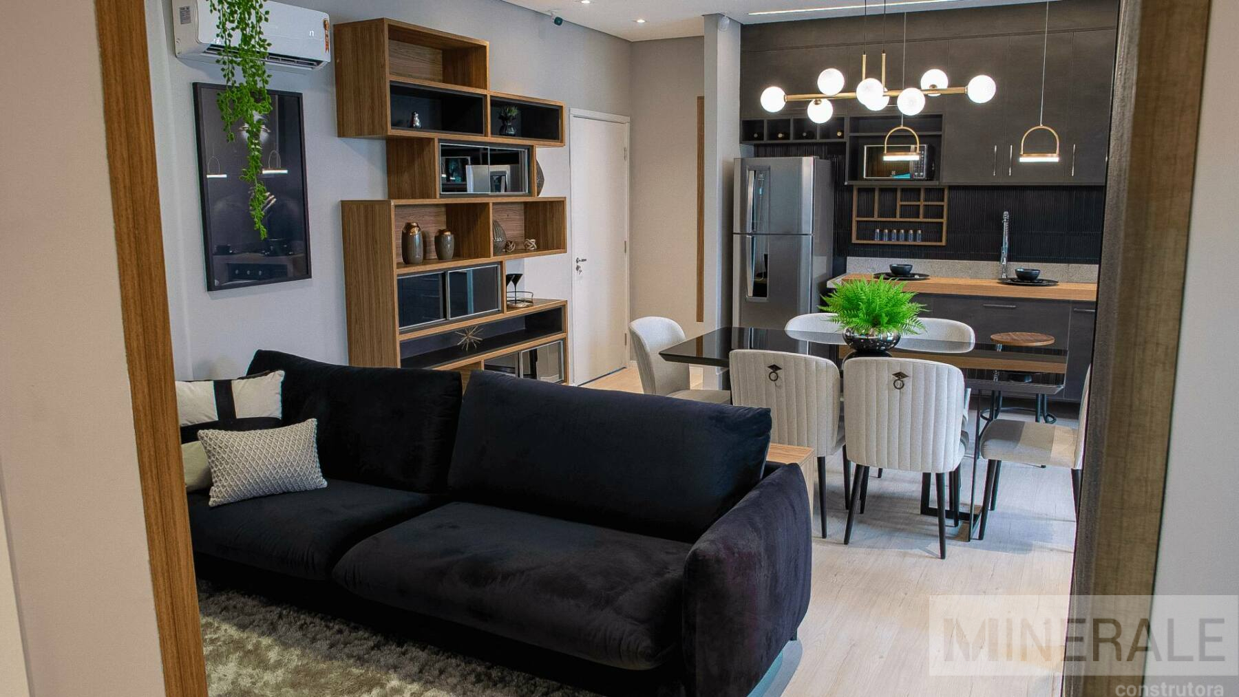 Living Integrado – Espaço total com 70m², 3 dormitórios, sendo 1 suíte, cozinha, área de serviço, varanda gourmet e banheiro social.