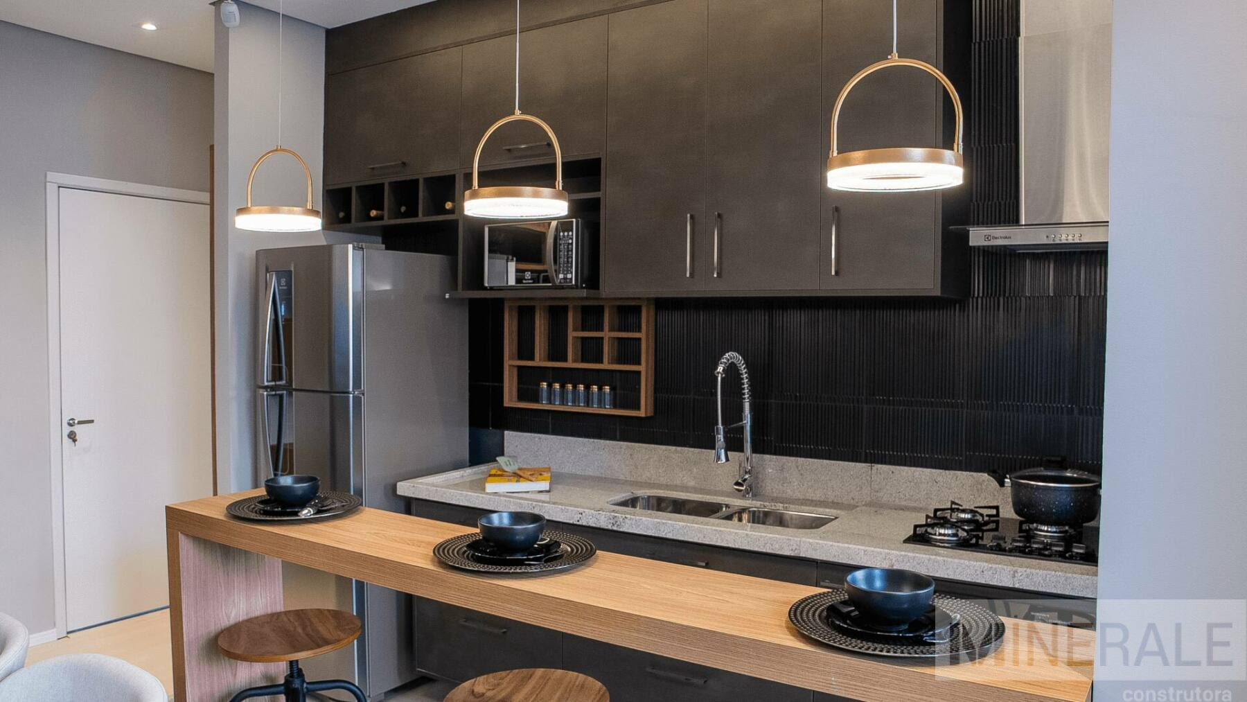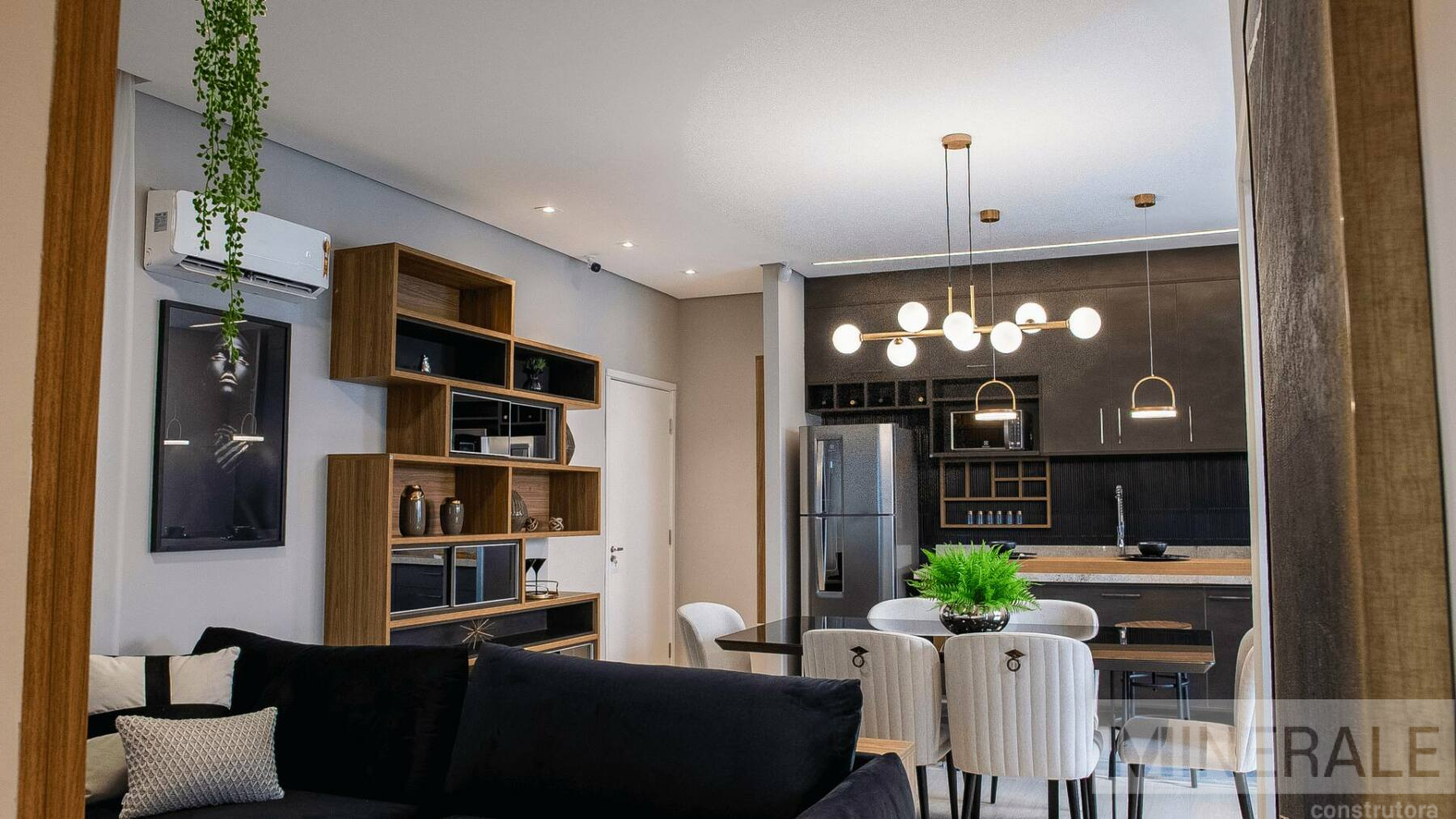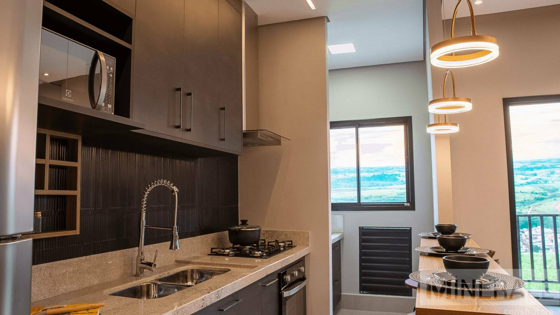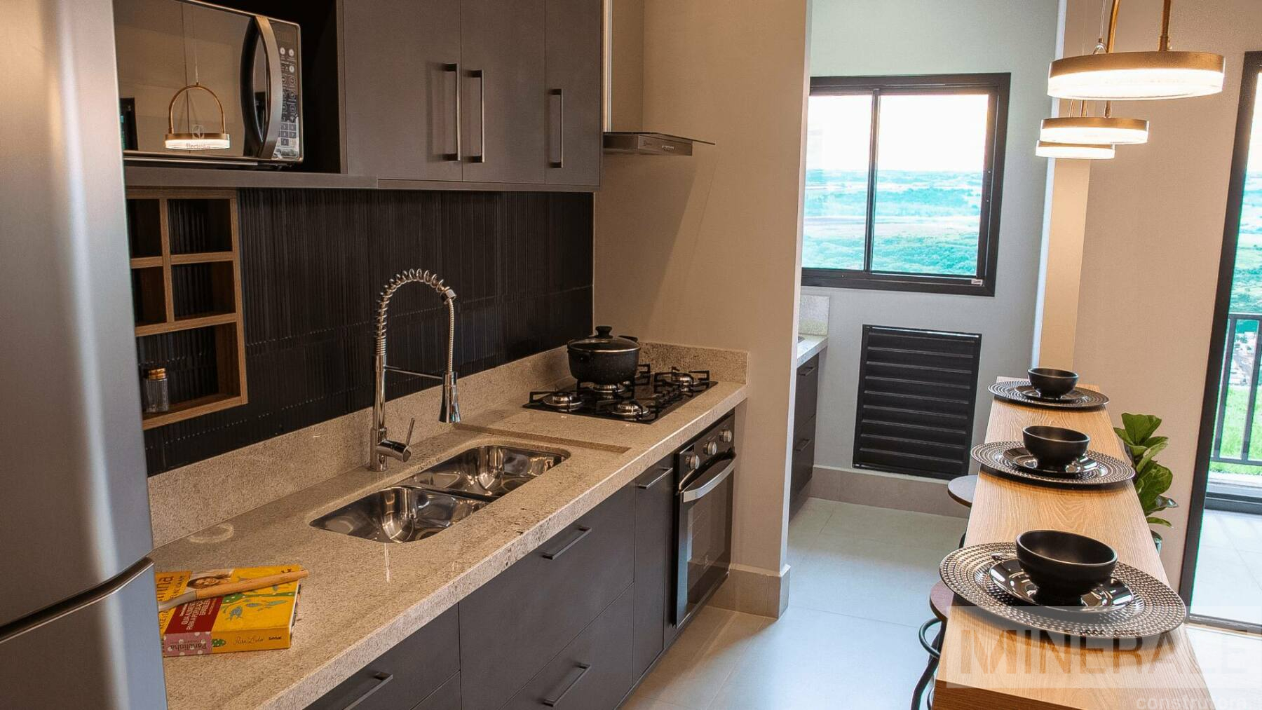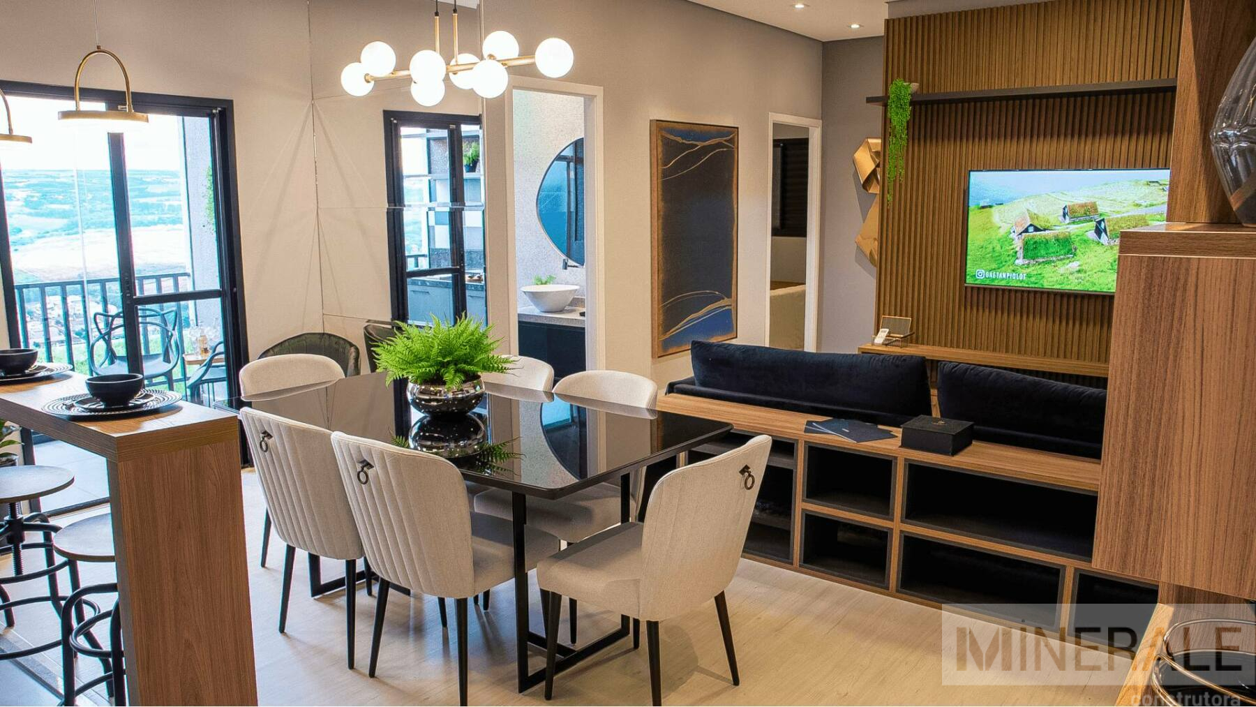 Living Integrado – Espaço total com 70m², 3 dormitórios, sendo 1 suíte, cozinha, área de serviço, varanda gourmet e banheiro social.