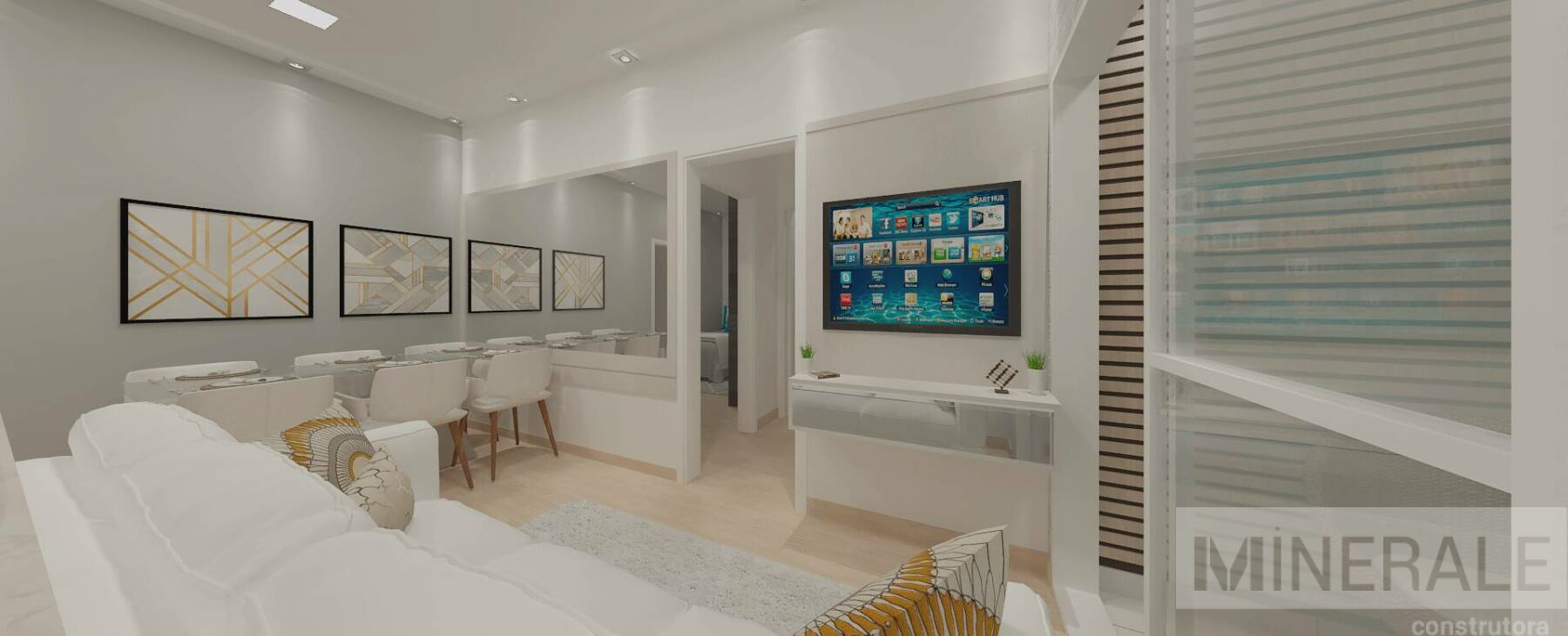 Living – Espaço total com 50m², 2 dormitórios, sendo 1 suíte, cozinha e área de serviço amplas, varanda gourmet e banheiro social.